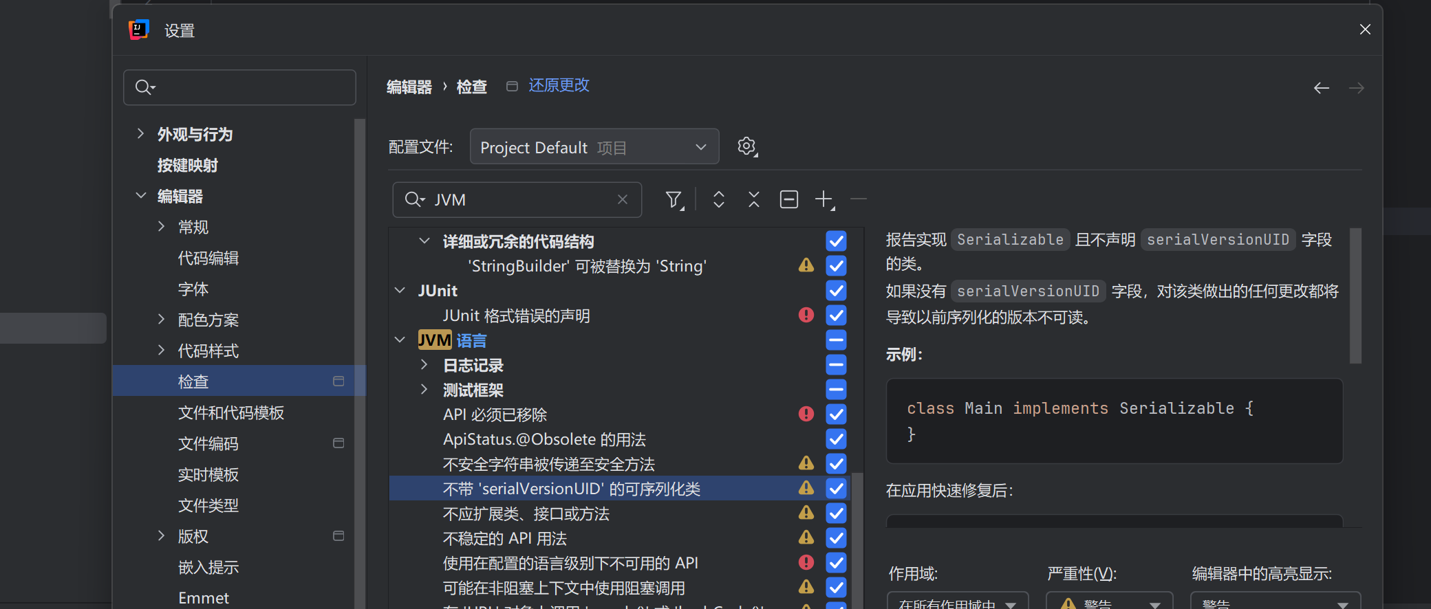 • 设置默认实现Serializable接口的类自动添加随机的serialVersionUID